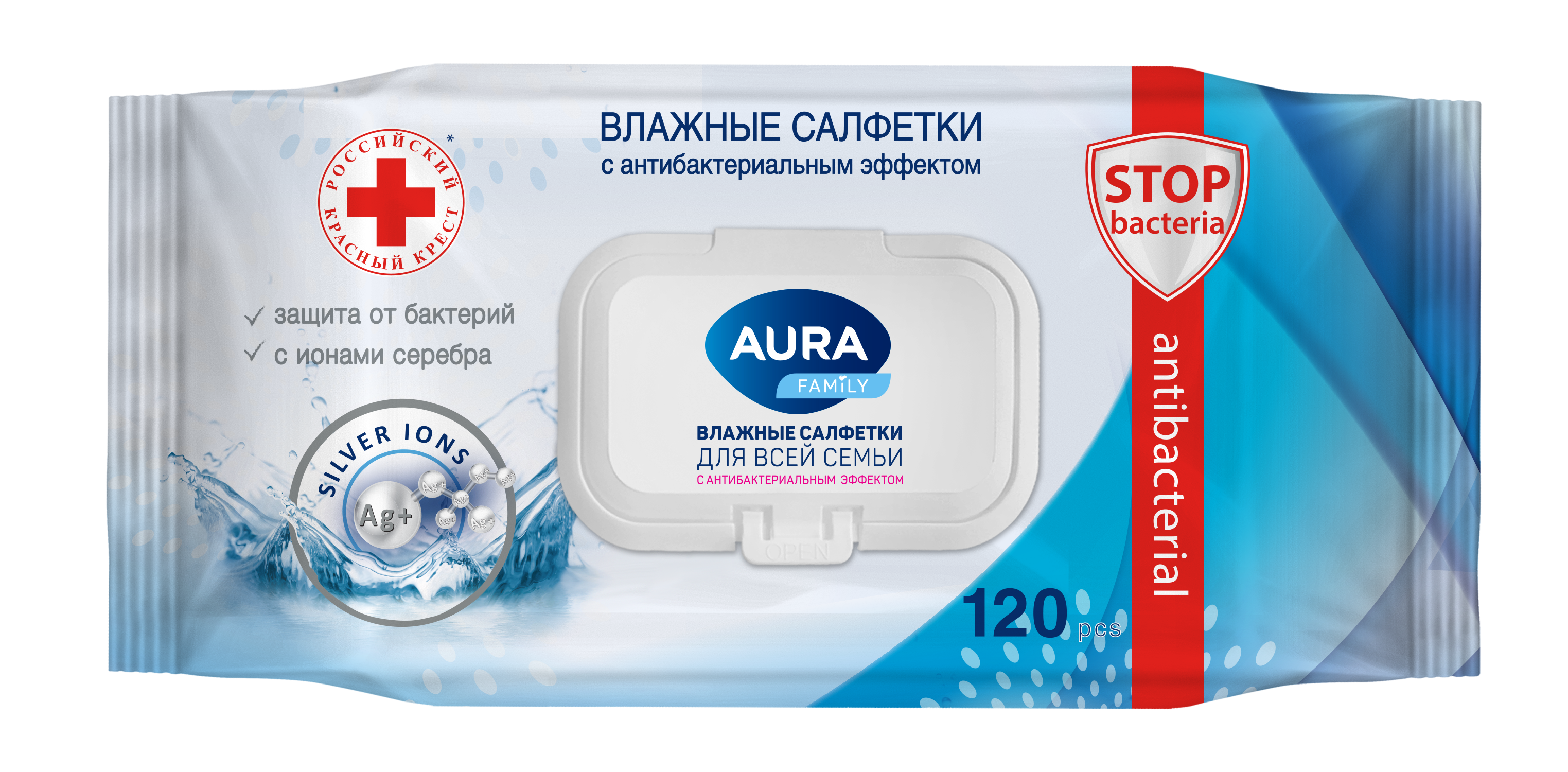 AURA FAMILY Влажные салфетки для всей семьи с антибактериальным эффектом в ассортименте big-pack с крышкой 120шт |