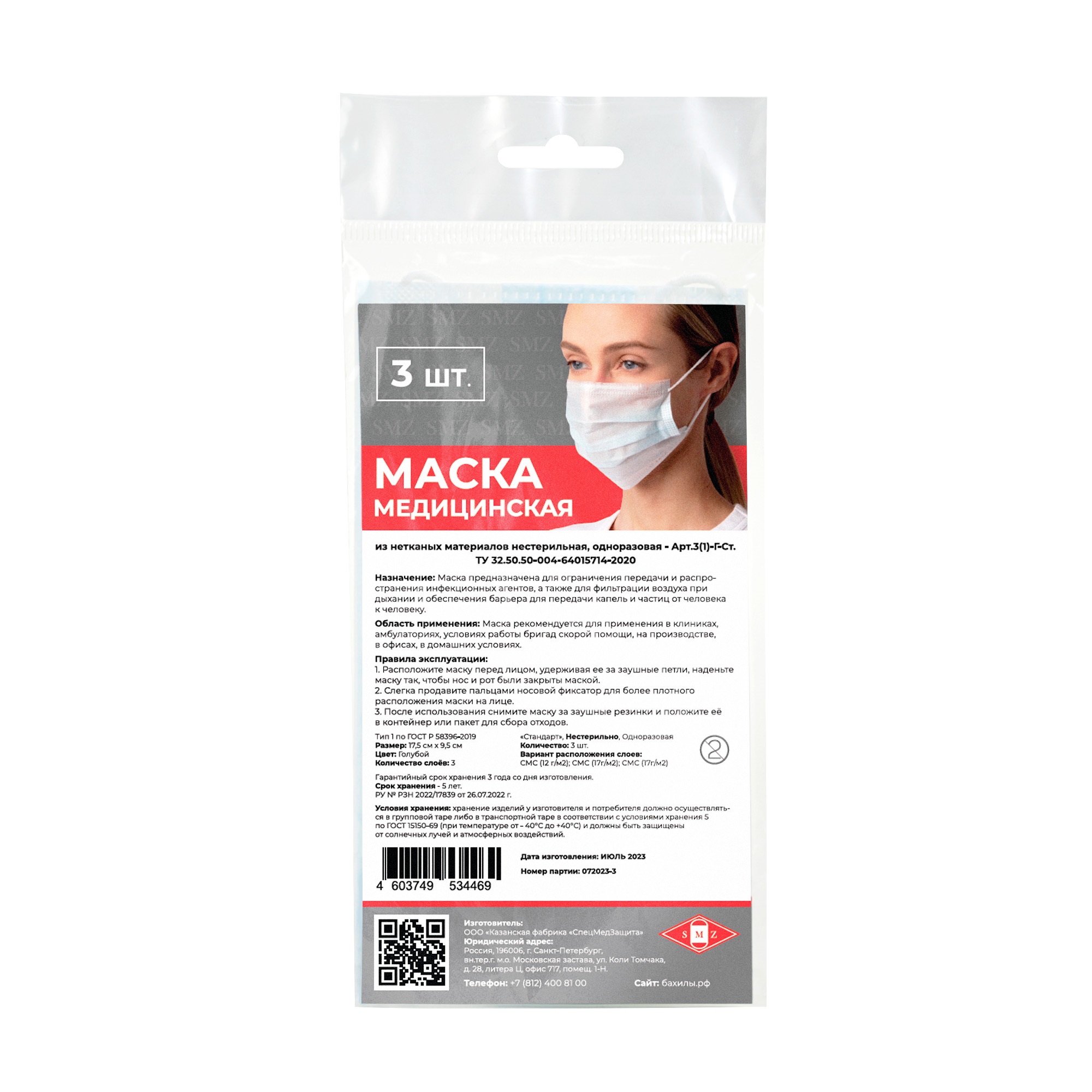 Маска медицинская из нетканых материалов нестерильная, однораз. - Арт.3(1)-Г-Ст. (голубая) №3/600 |